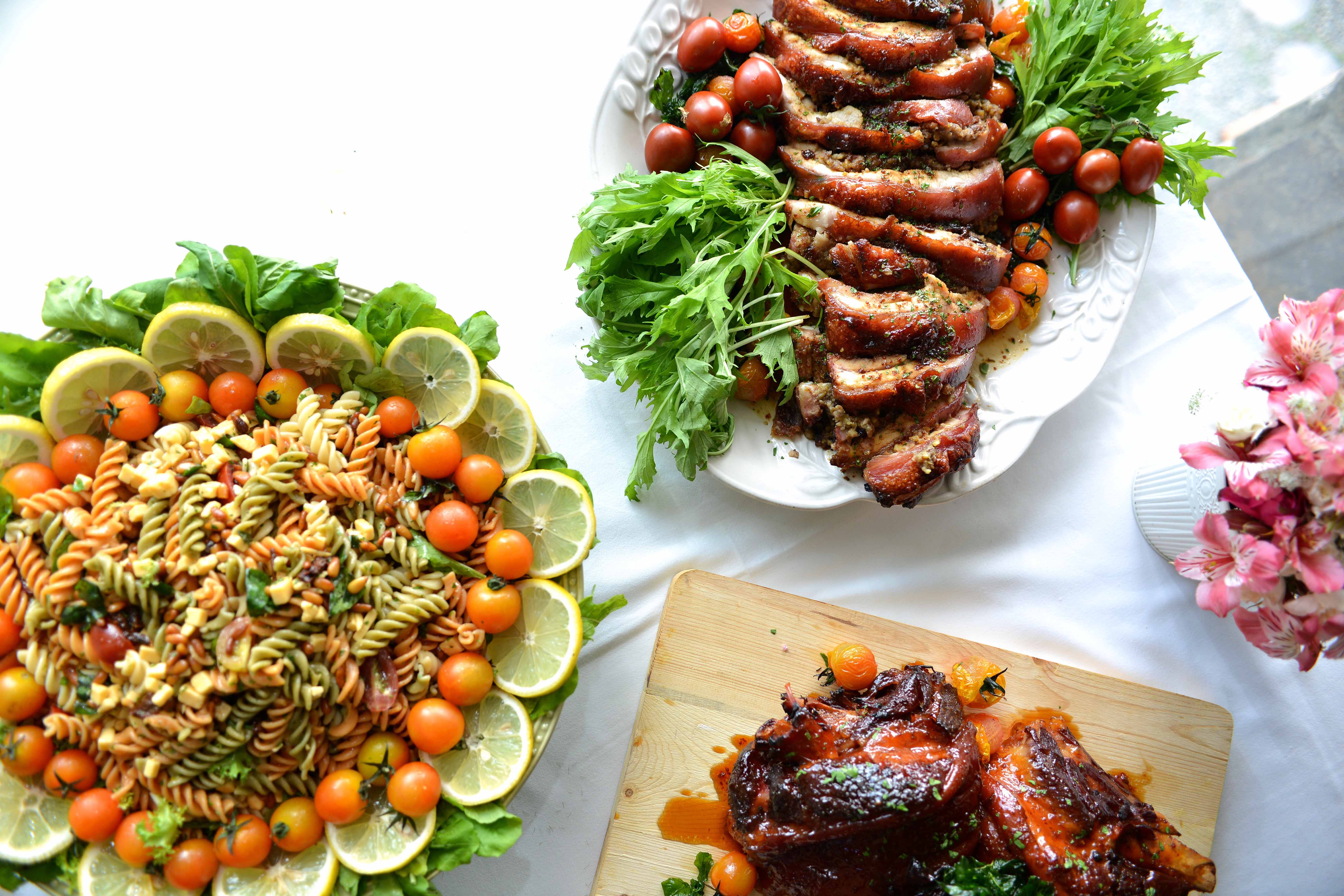 Crispy Roast Pork Stuffed with Chestnut Herbs, Homemade Honey-Glazed Ham with Pink Peppercorn, and Italian Salad Pasta