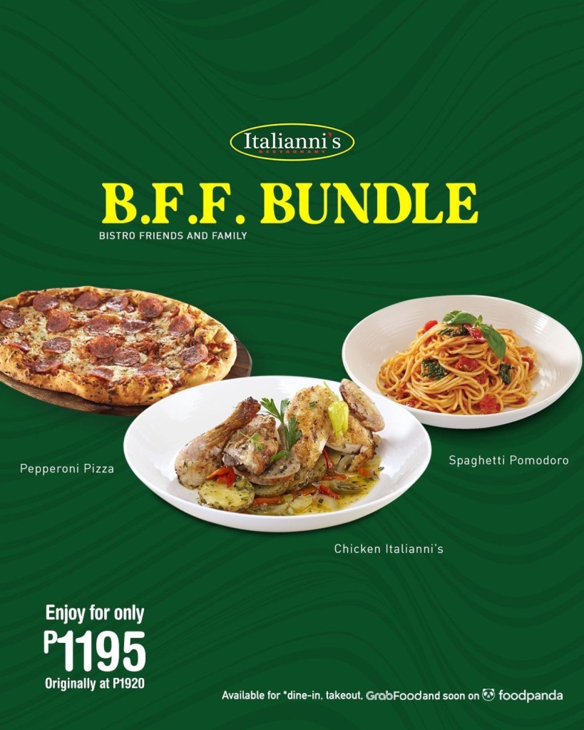 Aside from BOGO, Italianni’s has also launched the BFF (Bistro Friends and Family) Bundles with discounts of up to 30%. Your favorite dishes are combined to give you an amazing discount! For P1,195, you can enjoy bundles made up of Pepperoni Pizza, Spaghetti Pomodoro and Chicken Italianni’s.