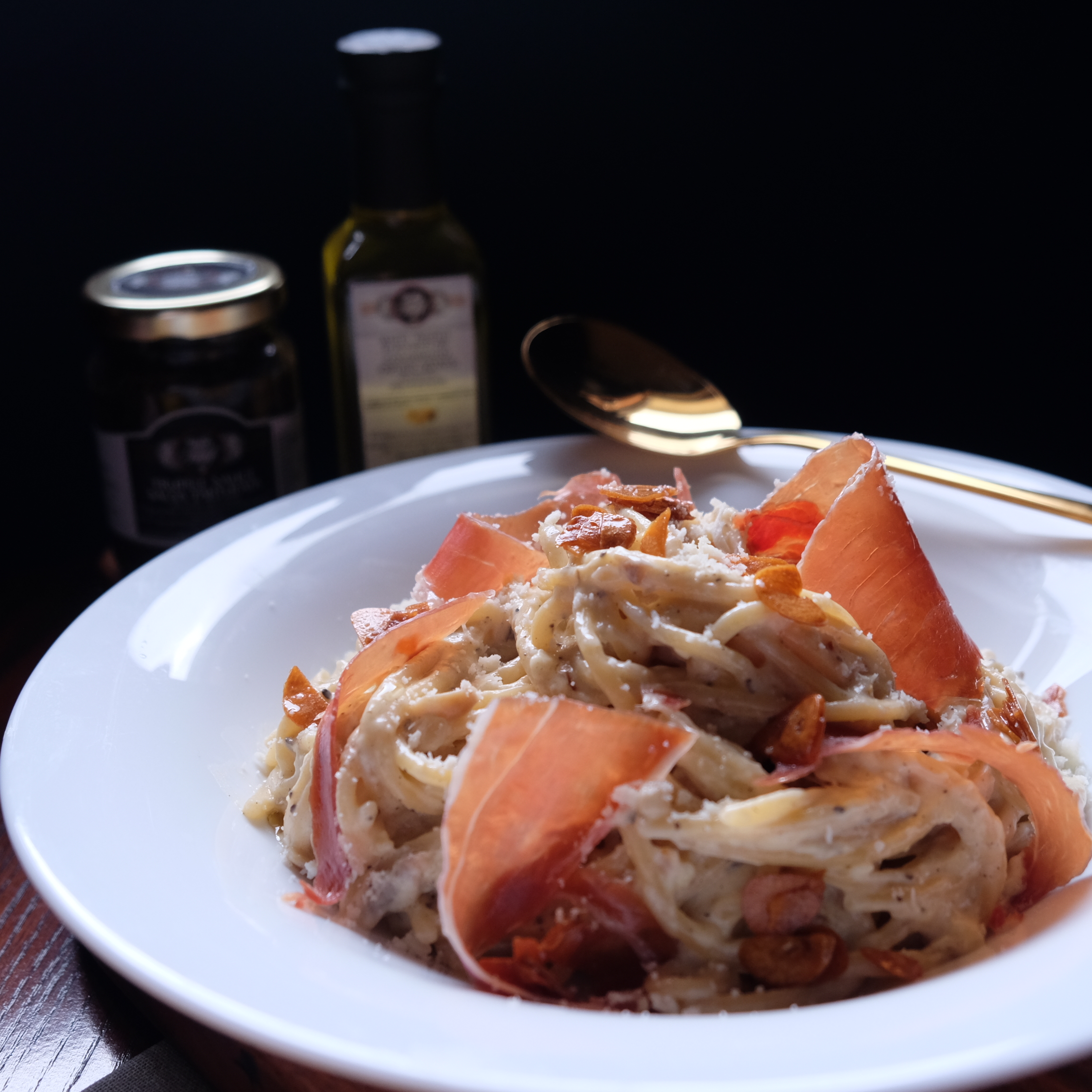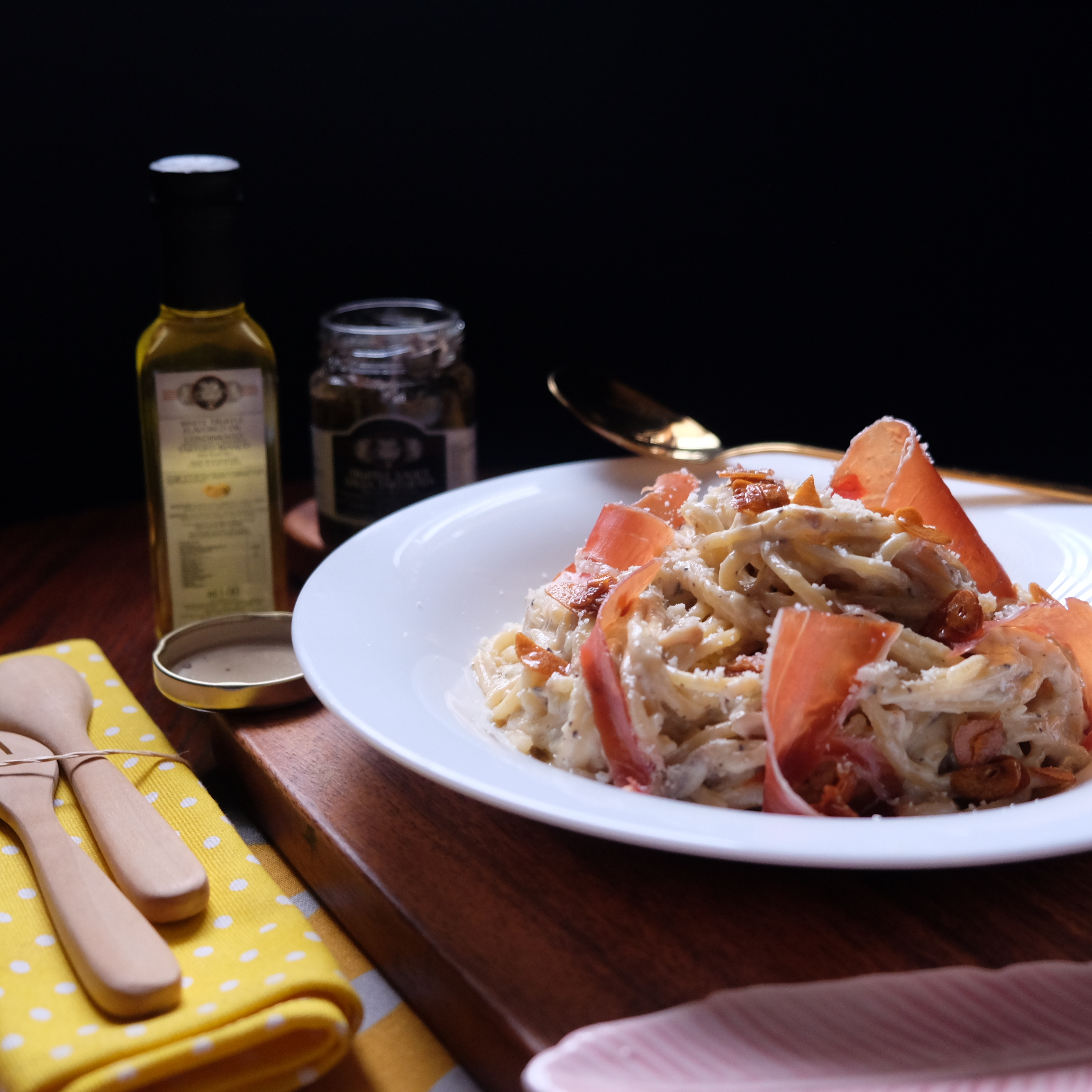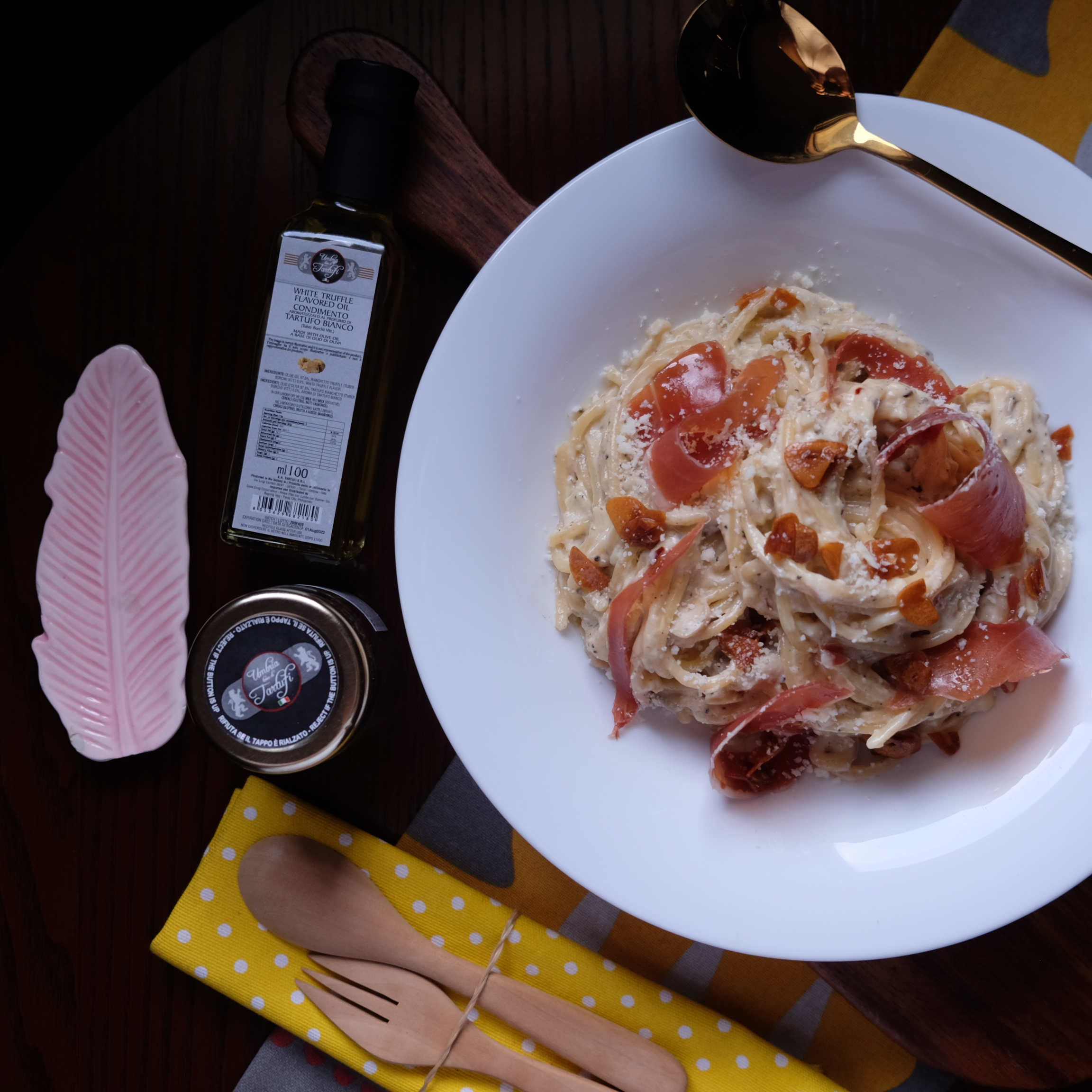 - Transfer pasta dish in a serving plate, and finish with Umbria Terra Di Tartufi White Truffle Oil, and Jamon Serrano.