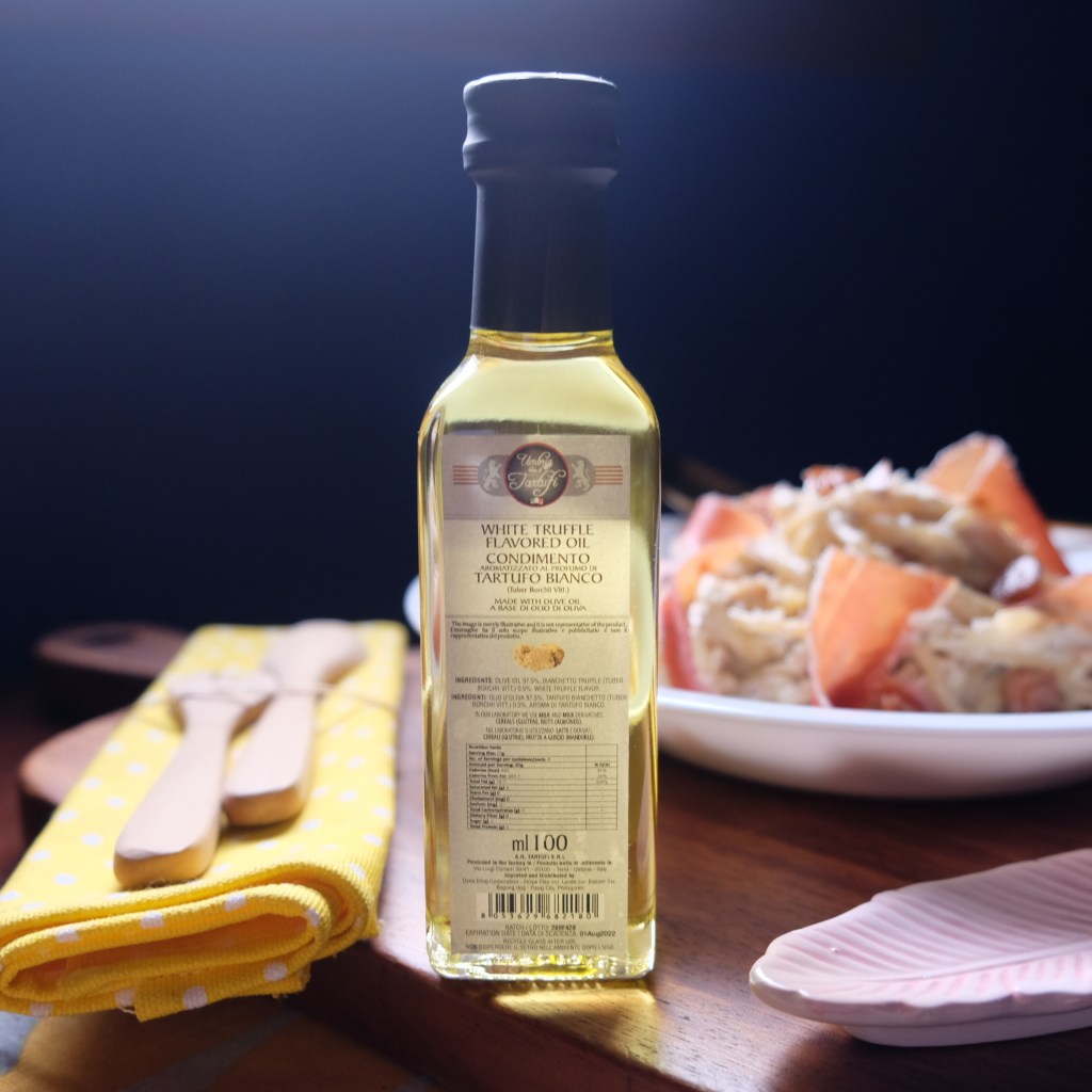 Umbria Terra Di Tartufi’s white truffle oil is a condiment based on olive oil, dehydrated Bianchetto truffle and white truffle aroma. It has a more delicate flavor with a slight garlicky taste and a hint of pepper. It is used almost exclusively as a finishing oil, meaning it is added to a dish near or at the end of preparation, as its potency is heat-sensitive and not suitable as a cooking oil.