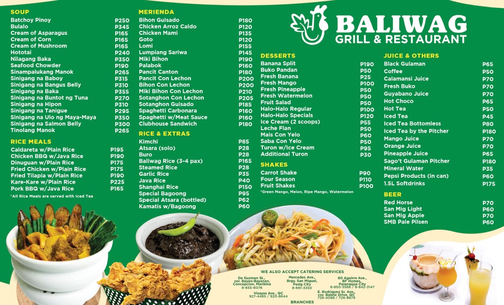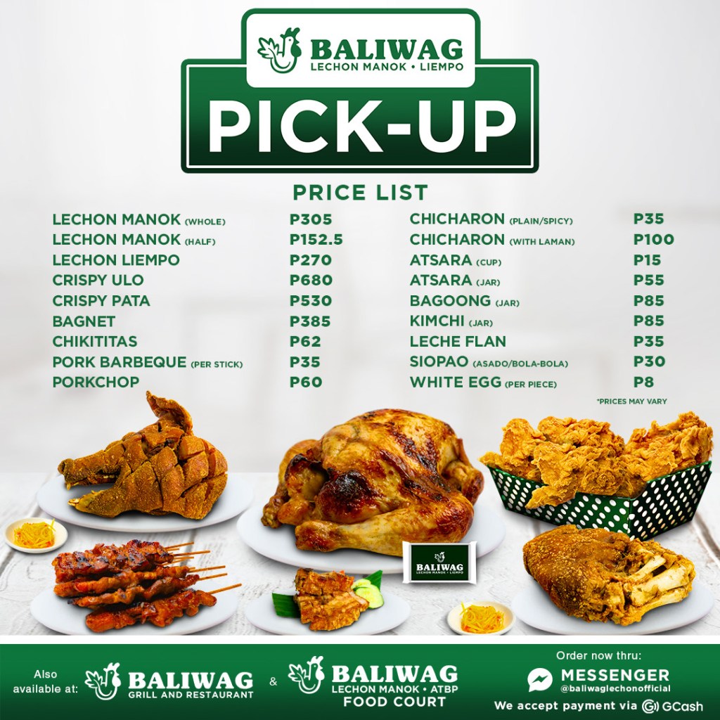 For those who miss eating out, you can visit the food court which offers the bestselling lechon manok. They also have two-ulam and three-ulam combo meals with viands such as dinuguan, kare-kare, ulo sa miso, and sinigang sa baboy, to name a few. Baliwag Grill & Restaurant offers a wider variety with their Baliwag Greats starting off with Sisig, Kare-Kare, Pancit Bihon, Pork Barbecue, Chicken Barbecue, Bagnet, Chop Suey, and more. They have other services as well, including delivery and catering for events and parties.