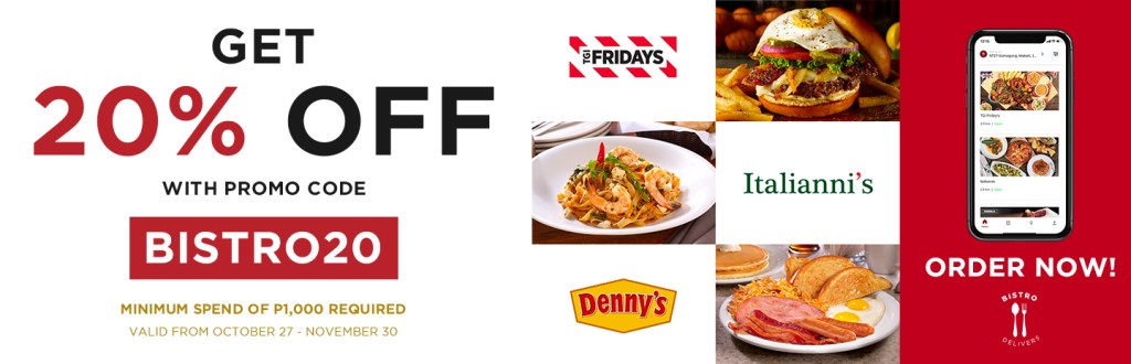 It’s a breeze to avail of this amazing offer. Simply place orders using promo code: BISTRO20 via the Bistro Delivers app and webstore www.bistrodelivers.com.ph