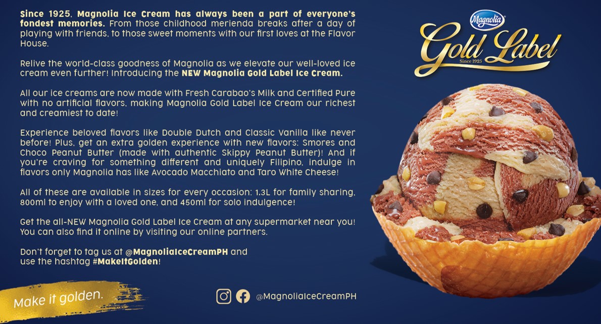 Shop Magnolia Gold Ice Cream at supermarkets and grocery stores, or online via San Miguel Frozen & Chilled on Shopee and Lazada, The SMC Hub and other online partners. Follow Magnolia Ice Cream Philippines on Facebook for updates.