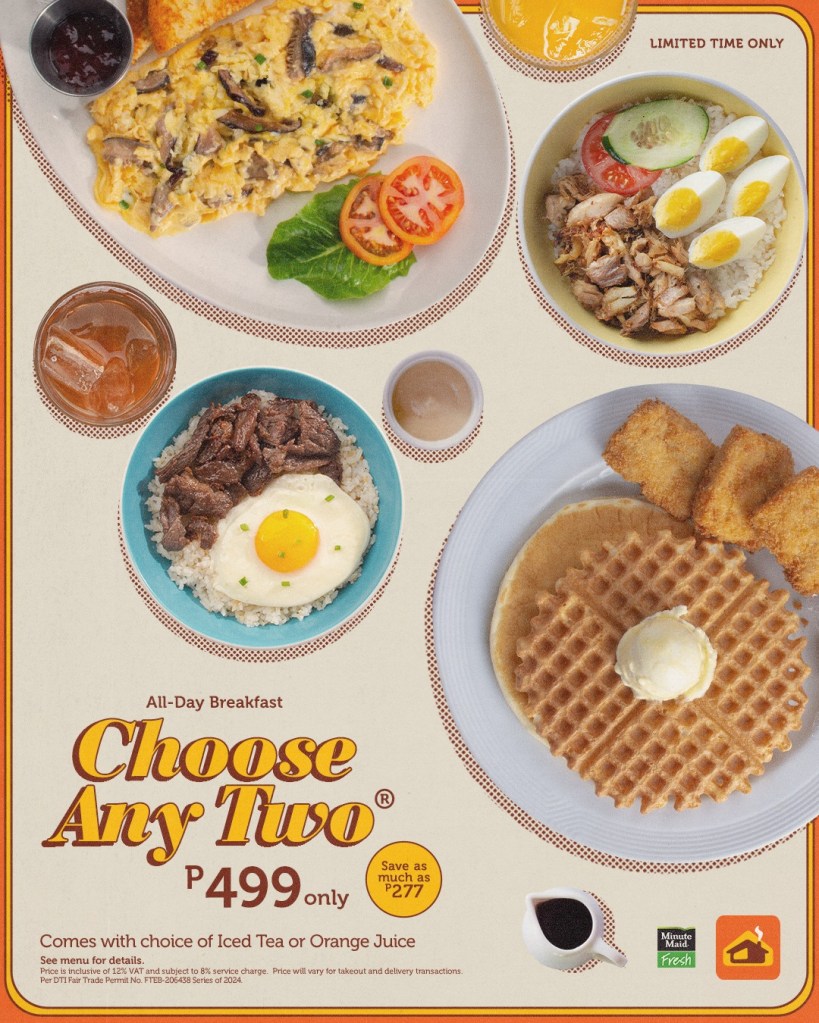 Pancake House’s all-day breakfast offerings are perfect for lovebirds, family duos, or best friends. With the Choose Any Two® promo, mix and match hearty plates like Beef Tapa Bowl, Classic Pancake & Waffle Duo, Adobo Sulipan Bowl, or a choice between a Ham & Cheese Omelette or Mushroom Omelette and two refreshing drinks—all for just P499. With savings of up to P277, it’s the perfect way to share a comforting meal anytime, anywhere.