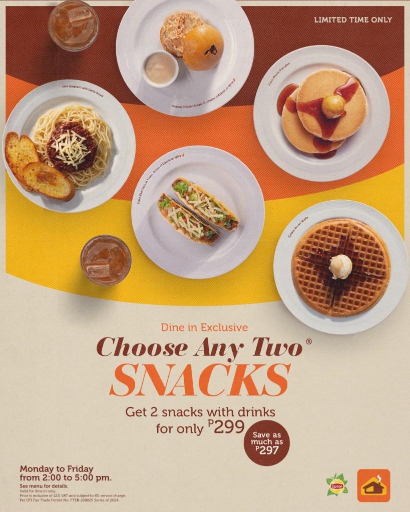 For those cozy weekday afternoons, Pancake House offers the Choose Any Two® Snacks promo. For just P299, enjoy two snacks and two glasses of iced tea with delicious options like Classic Pancakes, Golden Brown Waffles, Original Chicken Burger Jr., Solo Spaghetti with Garlic Bread, or the Best Tacos in Town. Available exclusively for dine-in from Monday to Friday, 2:00–5:00 PM, this deal is the perfect pick-me-up to get through the week.